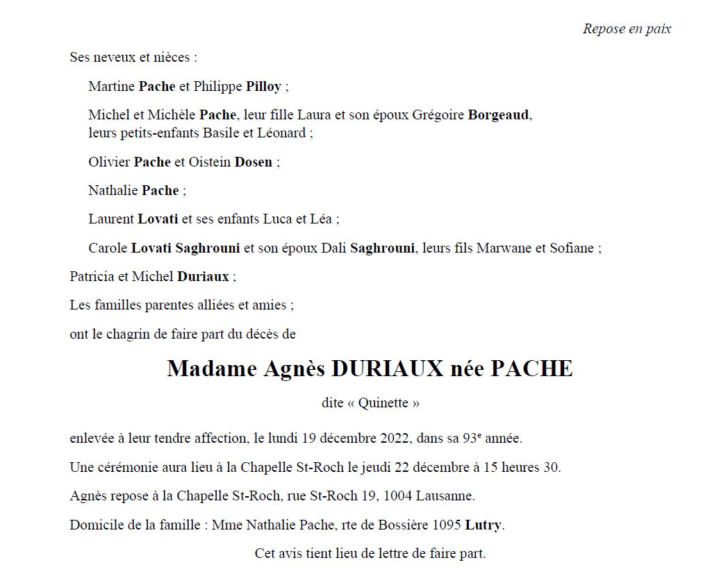 Agnès DURIAUX 09 nov. 1930 - 19 déc. 2022 Avis mortuaire PFG Télecharger PDF Partager sur: Galerie PreviousNext PreviousNext
