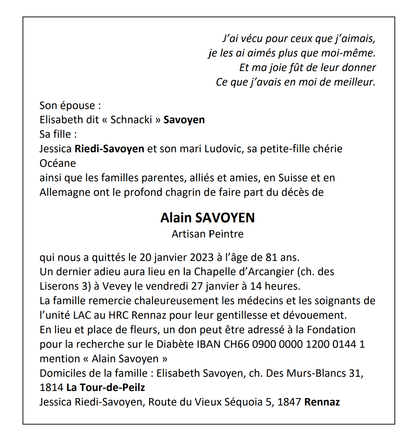 Alain SAVOYEN 19 déc. 1941 - 20 jan. 2023 Avis mortuaire PFG Télecharger PDF Partager sur: Galerie PreviousNext PreviousNext