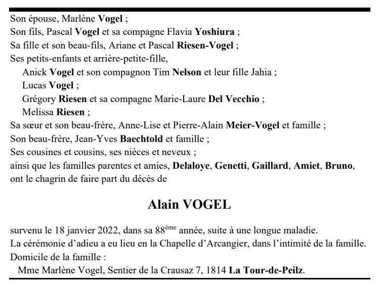 Alain VOGEL 28 avr. 1934 - 18 jan. 2022 Avis mortuaire PFG Télecharger PDF Partager sur: Galerie PreviousNext PreviousNext