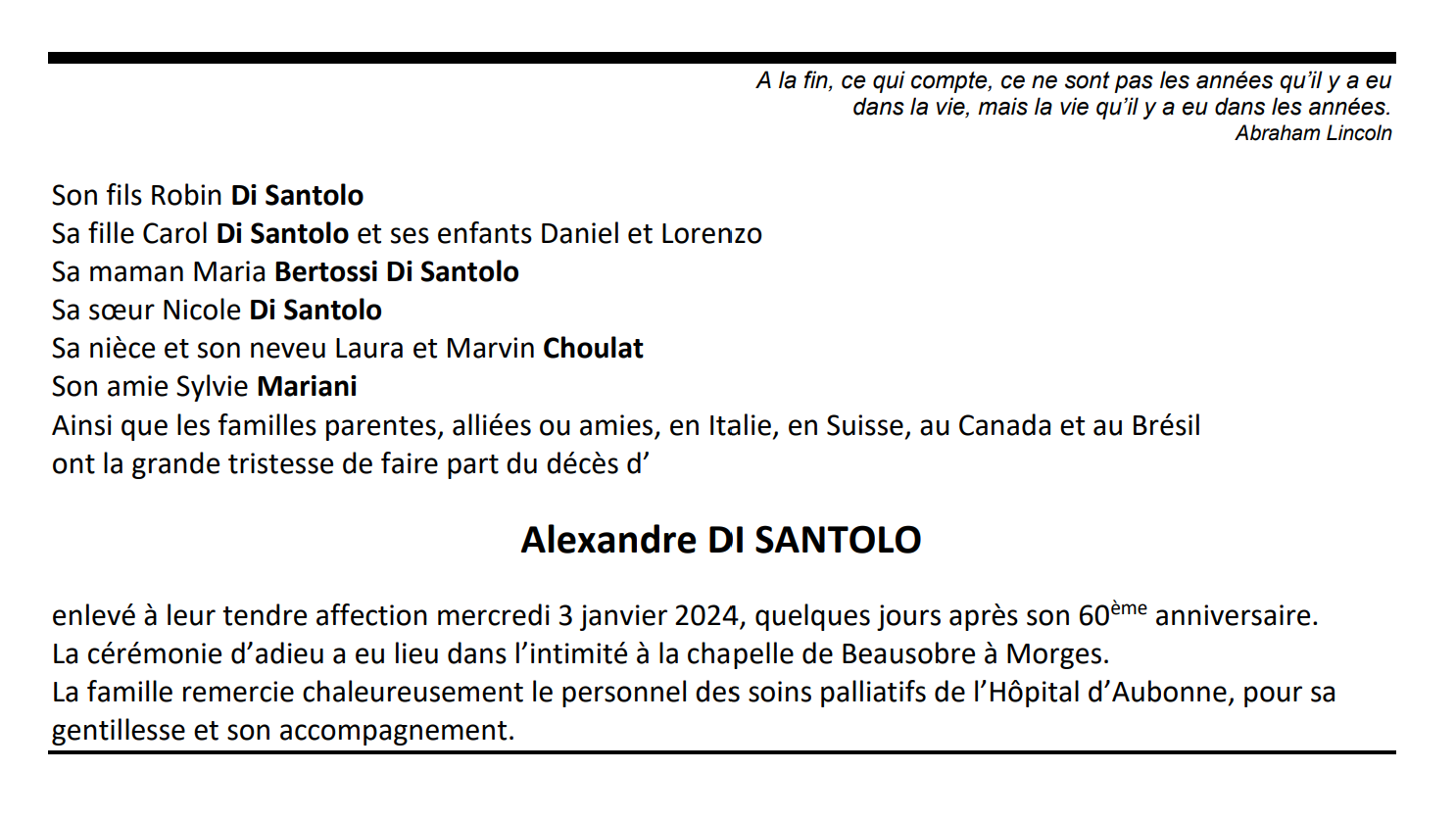 Alexandre DI SANTOLO 28 nov. 1963 - 03 jan. 2024 Avis mortuaire PFG Télecharger PDF Partager sur: Galerie PreviousNext PreviousNext
