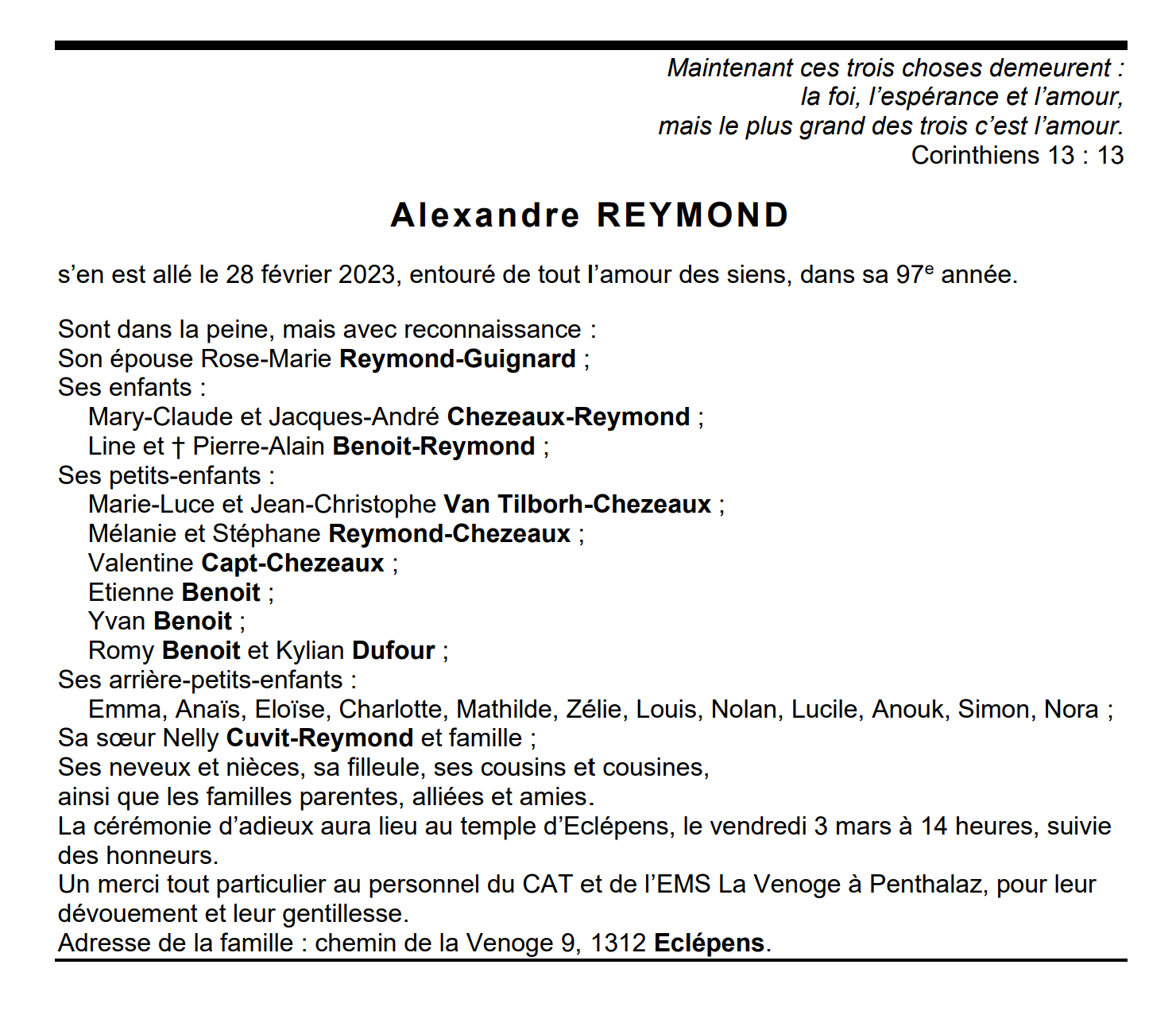 Alexandre REYMOND 20 déc. 1926 - 28 fév. 2023 Avis mortuaire PFG Télecharger PDF Partager sur: Galerie PreviousNext PreviousNext