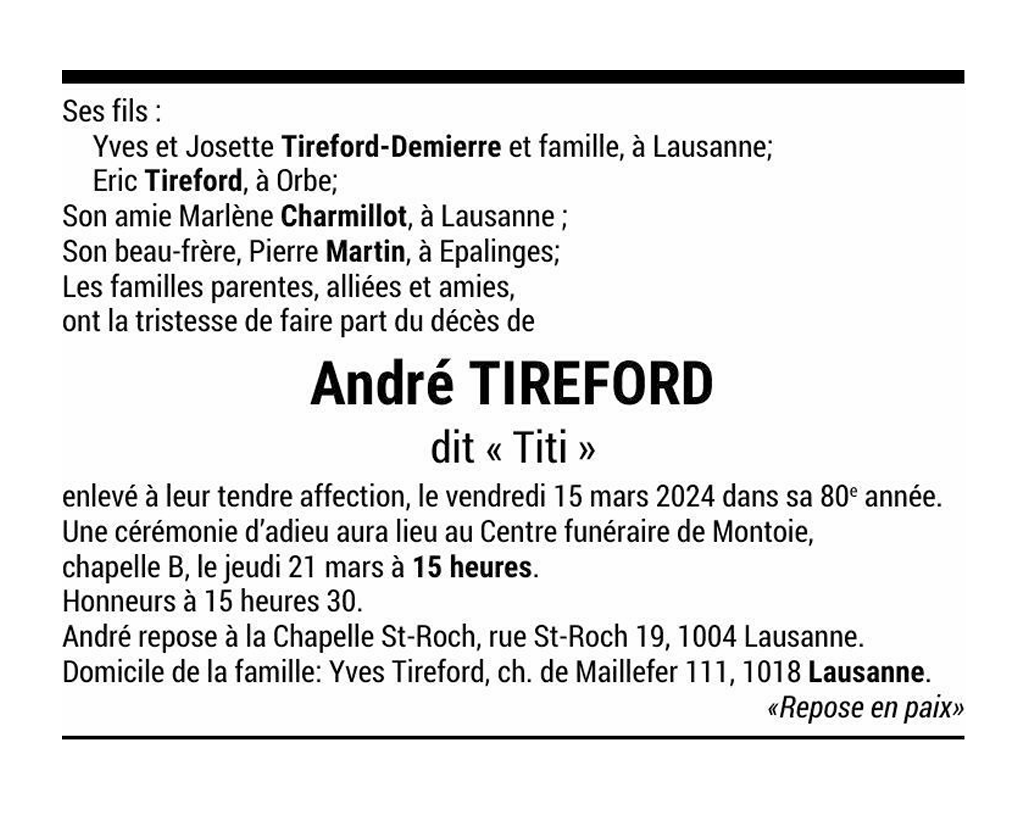André TIREFORD dit « Titi » 09 juil. 1944 - 15 mar. 2024 Avis mortuaire PFG Télecharger PDF Partager sur: Galerie PreviousNext PreviousNext