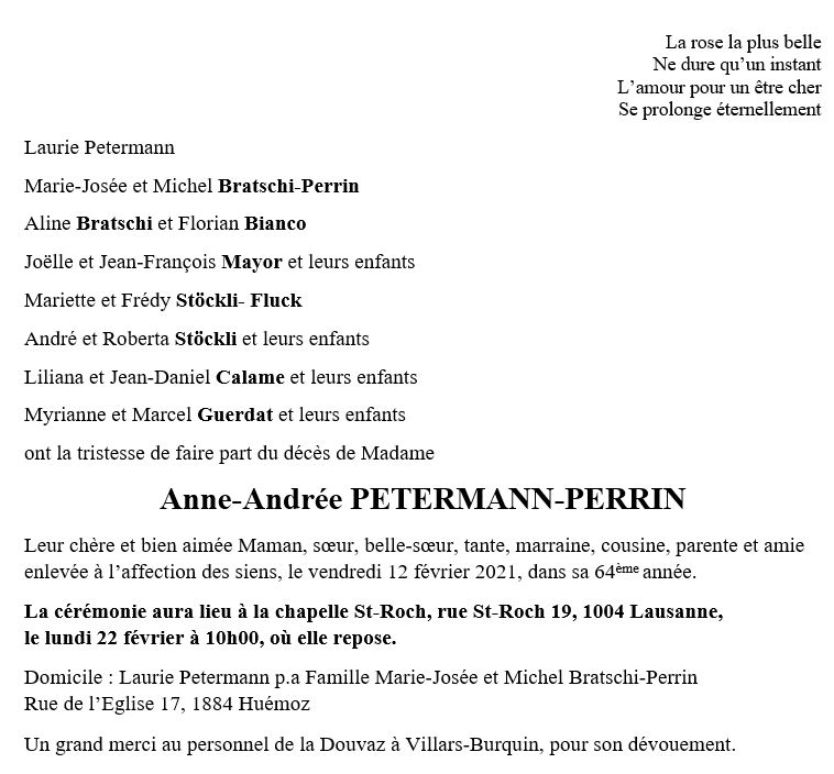 Anne-Andrée PETERMANN-PERRIN 02 avr. 1957 - 12 fév. 2021 Avis mortuaire PFG Télecharger PDF Partager sur: