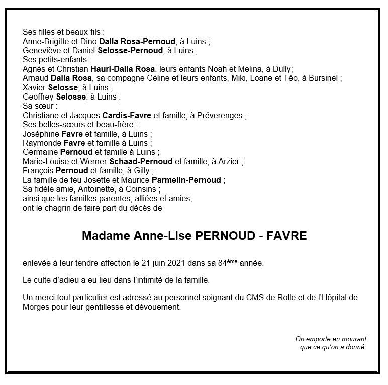 Anne-Lise PERNOUD - FAVRE 25 juin. 1937 - 21 juin. 2021 Avis mortuaire PFG Télecharger PDF Partager sur: Galerie PreviousNext PreviousNext