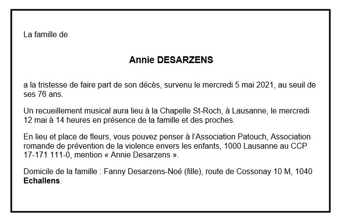 Annie DESARZENS 07 juin. 1945 - 05 mai. 2021 Avis mortuaire PFG Télecharger PDF Partager sur: Galerie PreviousNext PreviousNext