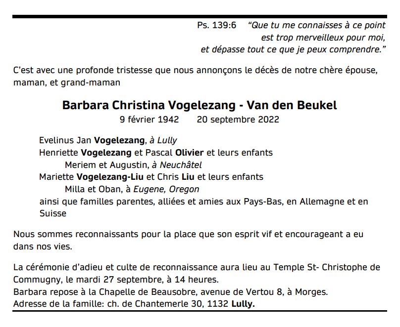 Barbara Christina Vogelezang - Van den Beukel 09 fév. 1942 - 20 sep. 2022 Avis mortuaire PFG Télecharger PDF Partager sur: Galerie PreviousNext PreviousNext