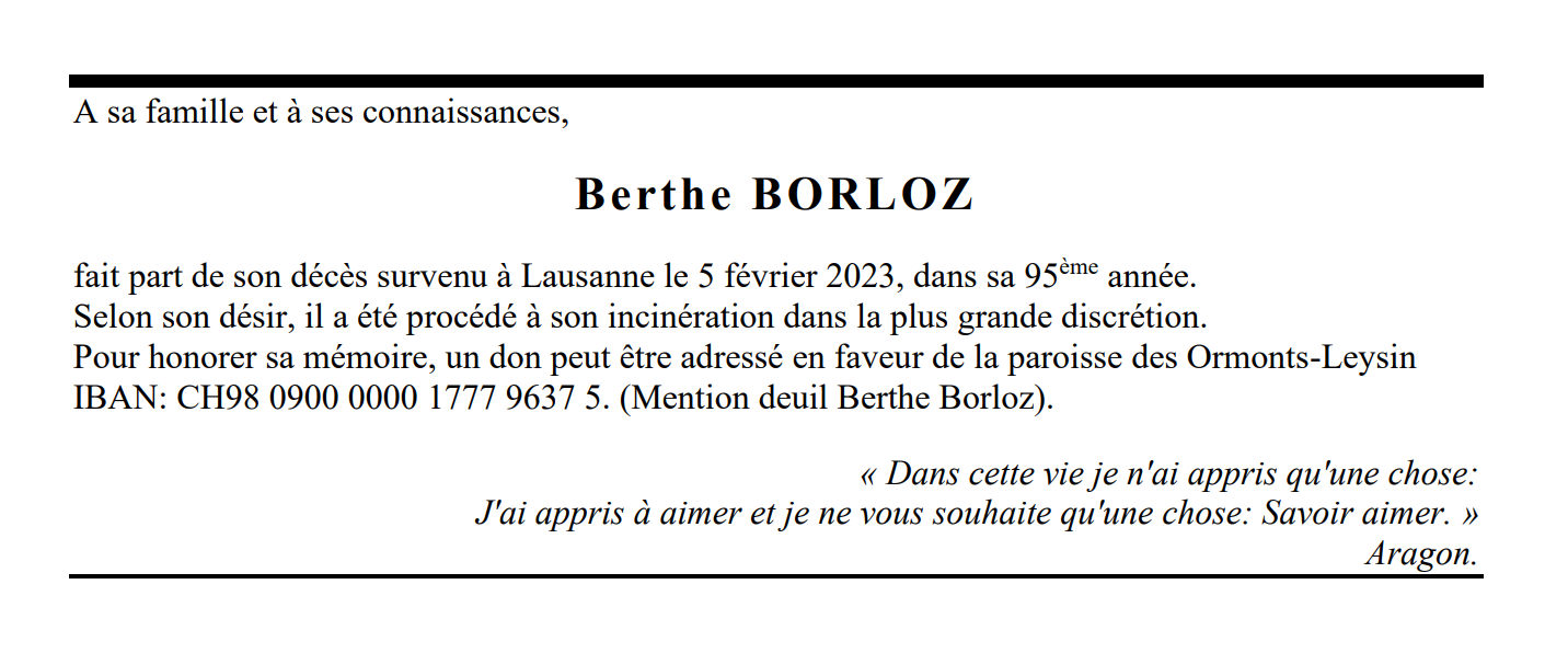 Berthe BORLOZ 23 mai. 1928 - 05 fév. 2023 Avis mortuaire PFG Télecharger PDF Partager sur: Galerie PreviousNext PreviousNext