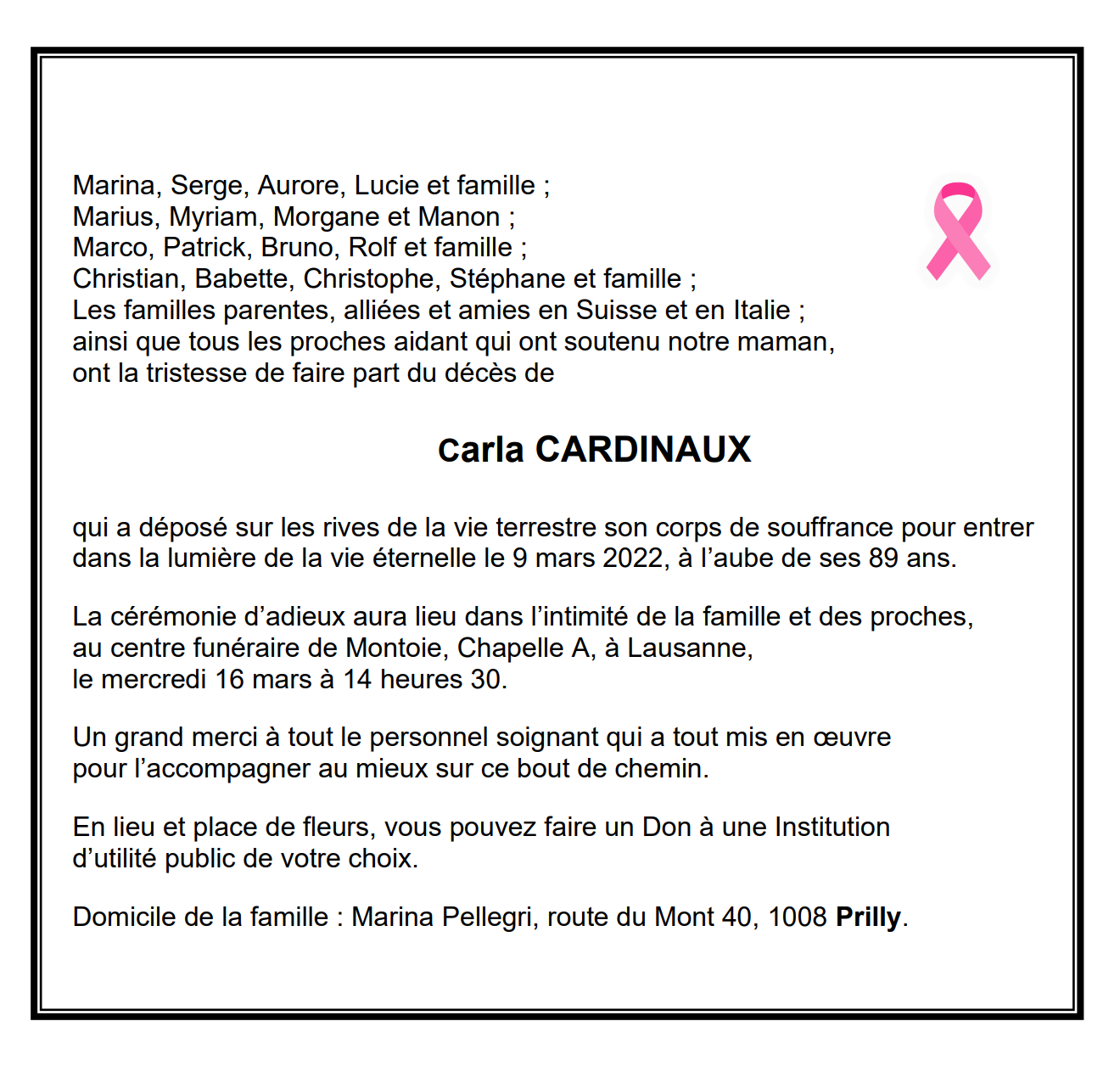 Carla CARDINAUX 09 mar. 2022 Avis mortuaire PFG Télecharger PDF Partager sur: Galerie PreviousNext PreviousNext