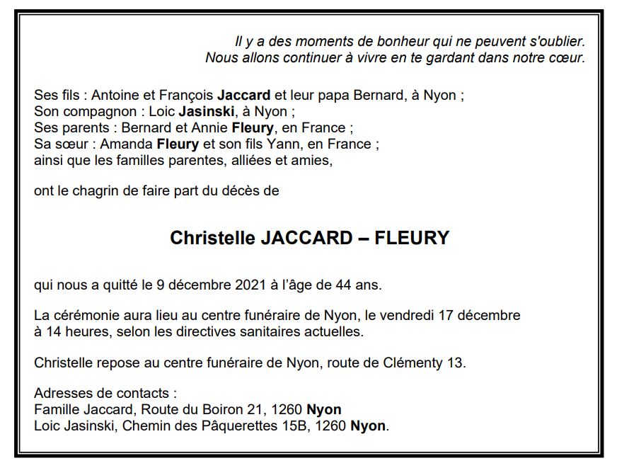 Christelle JACCARD – FLEURY 14 fév. 1977 - 09 déc. 2021 Avis mortuaire PFG Télecharger PDF Partager sur: Galerie PreviousNext PreviousNext