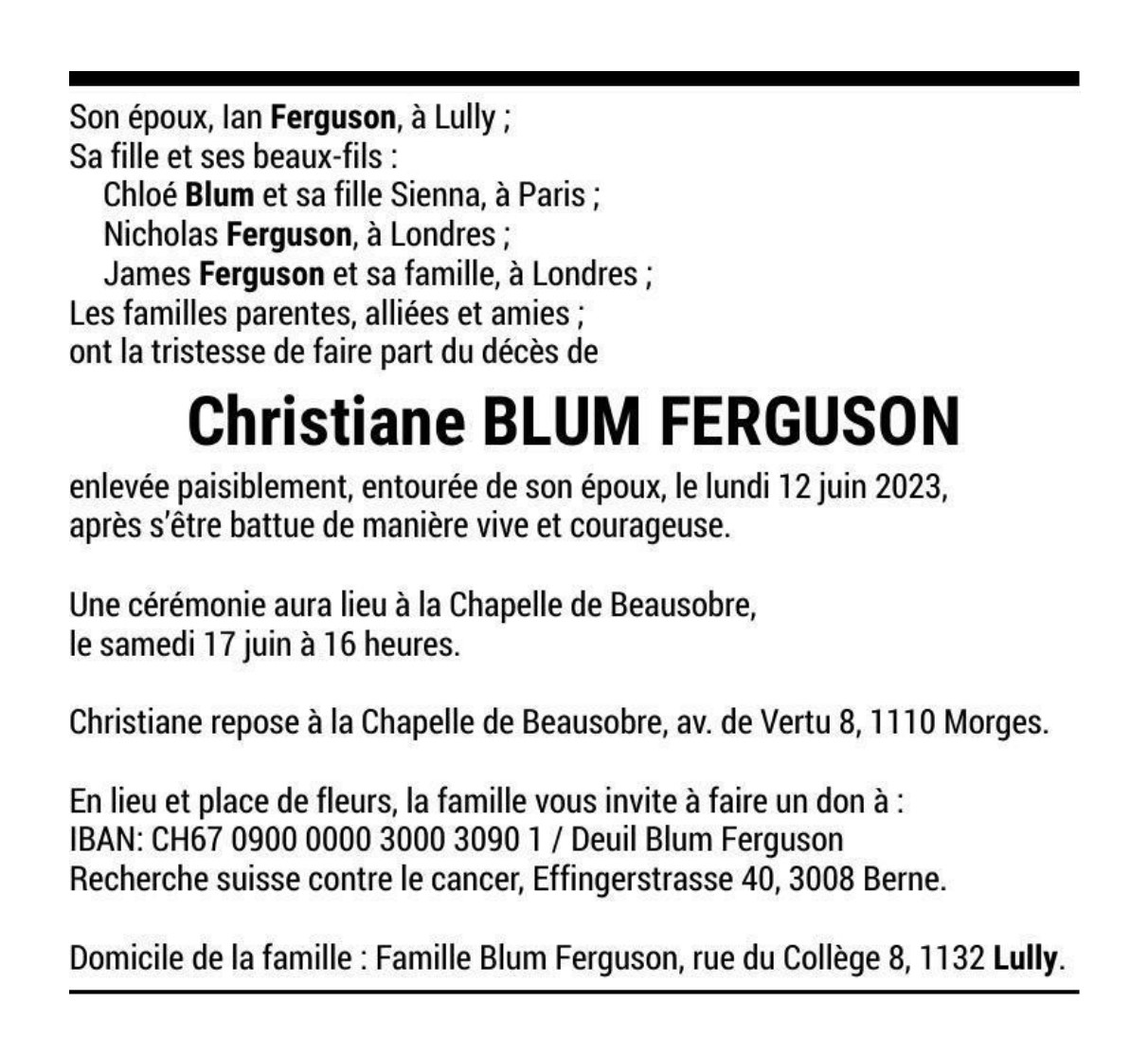 Christiane BLUM FERGUSON 15 sep. 1948 - 12 juin. 2023 Avis mortuaire PFG Télecharger PDF Partager sur: Galerie PreviousNext PreviousNext