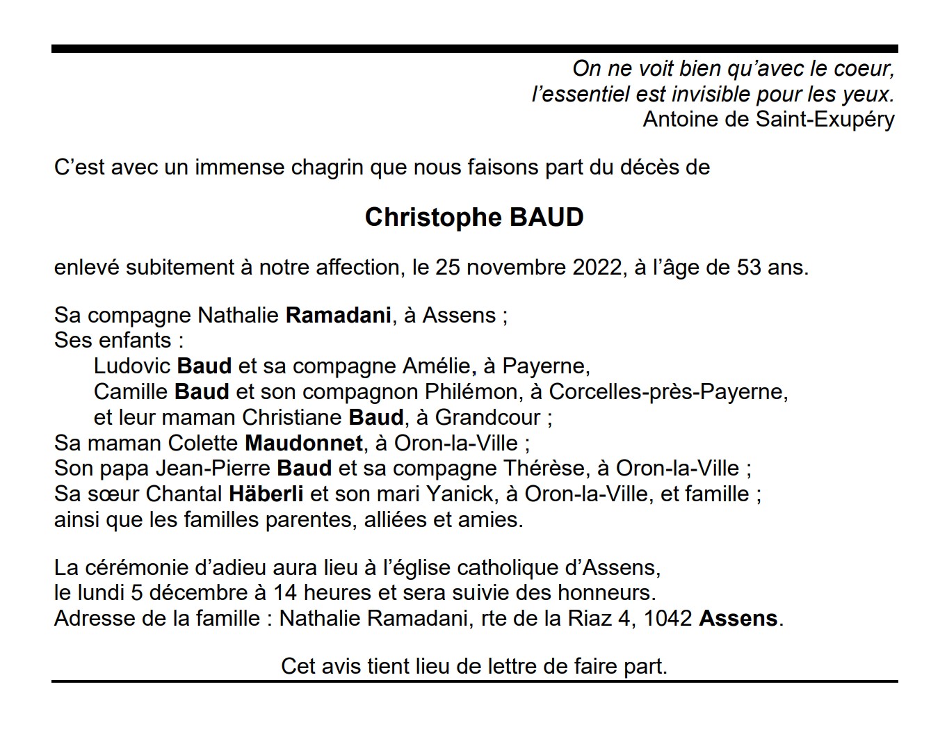 Christophe BAUD 10 fév. 1969 - 25 nov. 2022 Avis mortuaire PFG Télecharger PDF Partager sur: Galerie PreviousNext PreviousNext