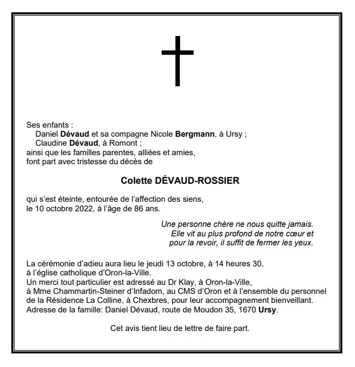 Colette DÉVAUD-ROSSIER 11 juin. 1936 - 10 oct. 2022 Avis mortuaire PFG Télecharger PDF Partager sur: Galerie PreviousNext PreviousNext