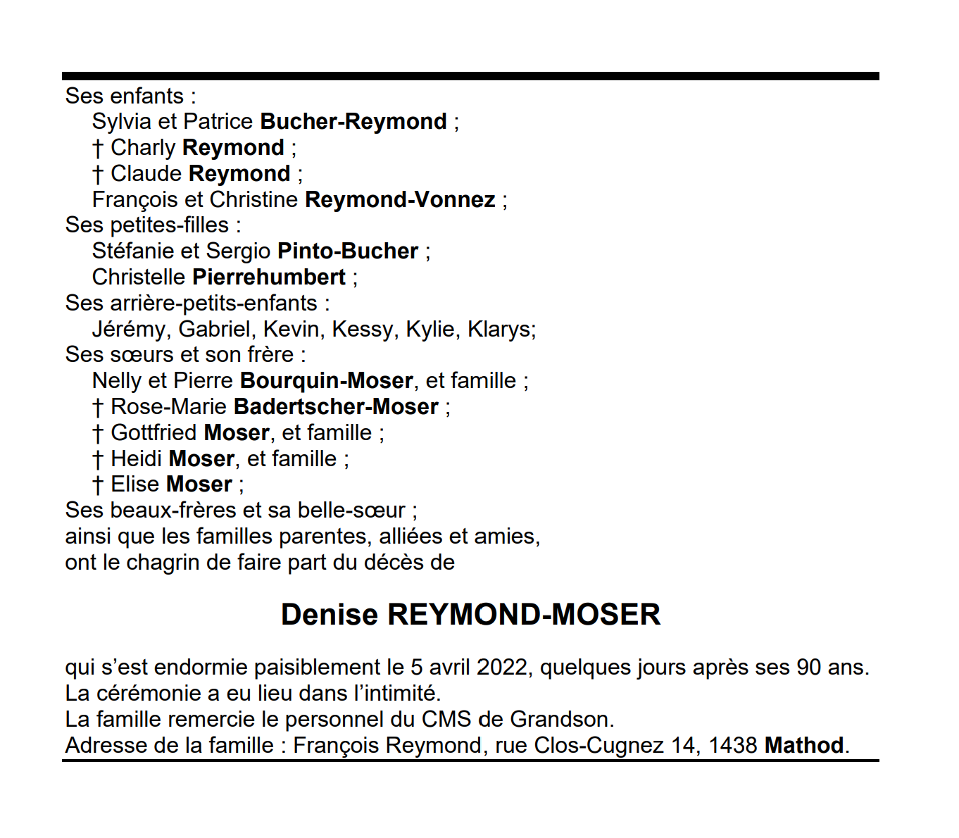 Denise REYMOND-MOSER 26 mar. 1932 - 05 avr. 2022 Avis mortuaire PFG Télecharger PDF Partager sur: Galerie PreviousNext PreviousNext