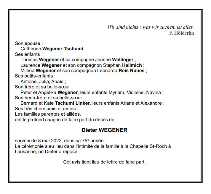 Dieter WEGENER 16 juin. 1947 - 08 mai. 2022 Avis mortuaire PFG Télecharger PDF Partager sur: Galerie PreviousNext PreviousNext