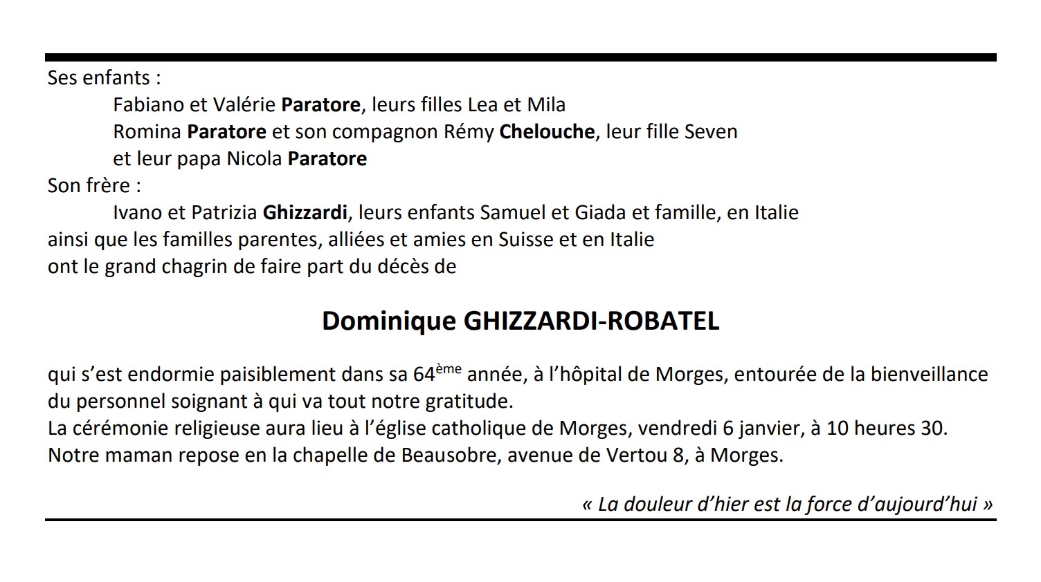 Dominique GHIZZARDI-ROBATEL 07 avr. 1959 - 03 jan. 2023 Avis mortuaire PFG Télecharger PDF Partager sur: Galerie PreviousNext PreviousNext