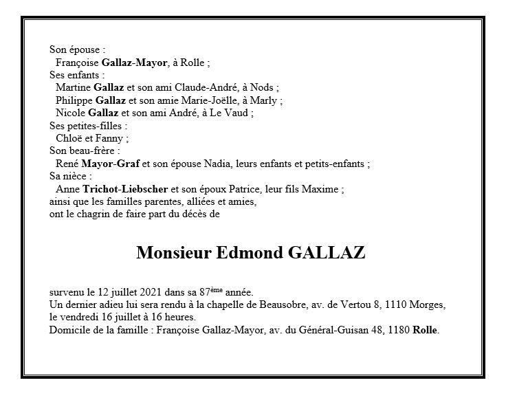 Edmond GALLAZ 17 sep. 1934 - 12 juil. 2021 Avis mortuaire PFG Télecharger PDF Partager sur: Galerie PreviousNext PreviousNext
