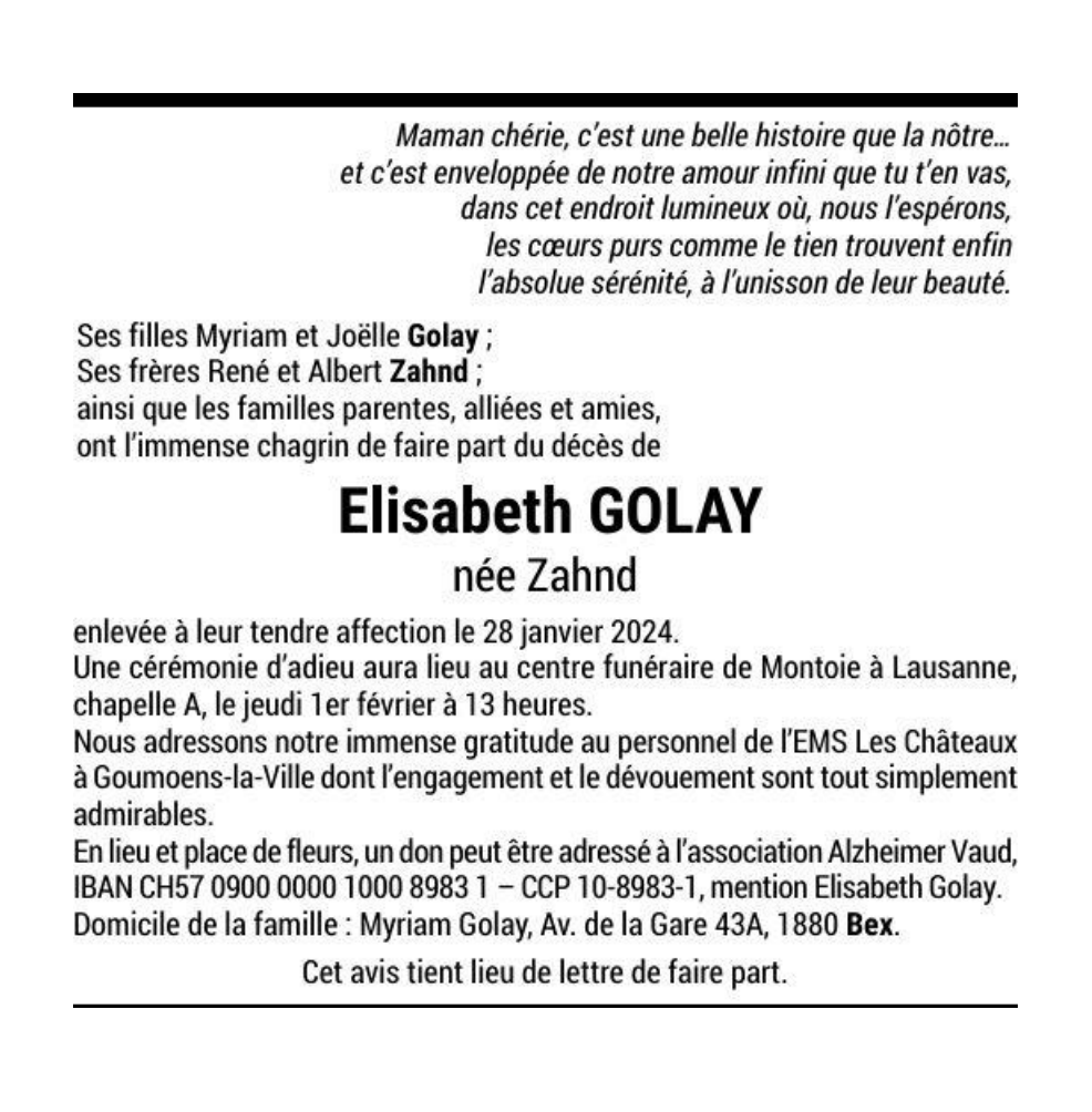 Elisabeth GOLAY née Zahnd 11 jan. 1938 - 28 jan. 2024 Avis mortuaire PFG Télecharger PDF Partager sur: Galerie PreviousNext PreviousNext