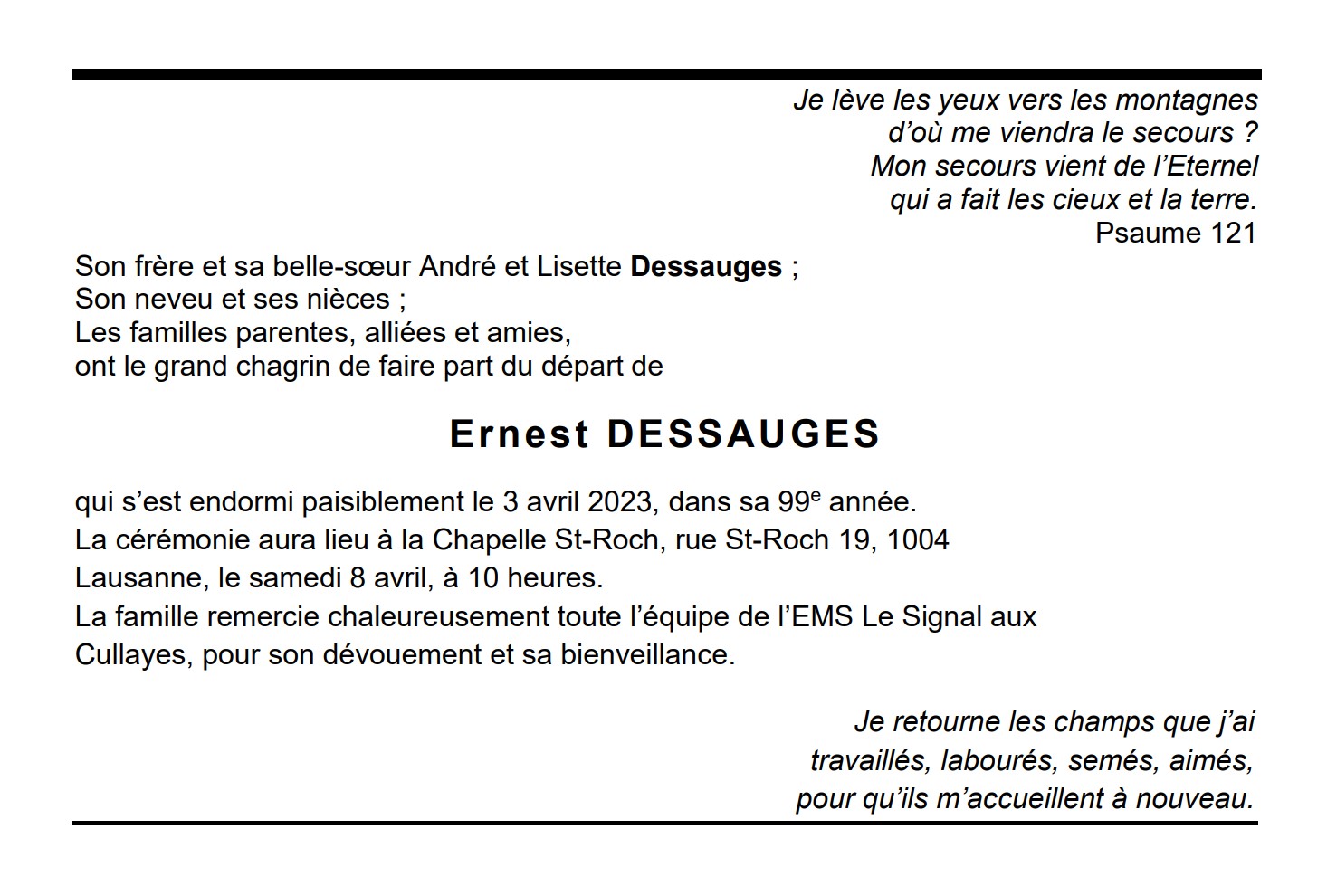 Ernest DESSAUGES 13 sep. 1924 - 03 avr. 2023 Avis mortuaire PFG Télecharger PDF Partager sur: Galerie PreviousNext PreviousNext