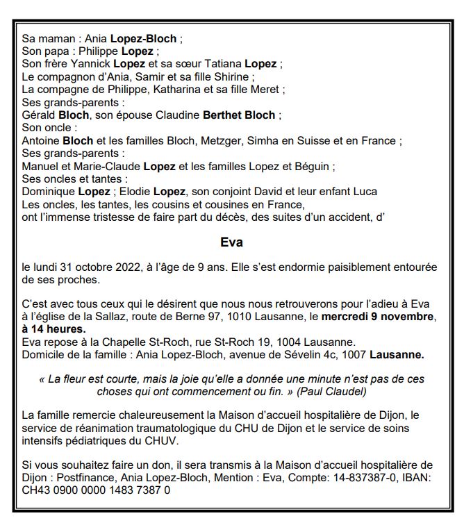 Eva 19 oct. 2013 - 31 oct. 2022 Avis mortuaire PFG Télecharger PDF Partager sur: Galerie PreviousNext PreviousNext