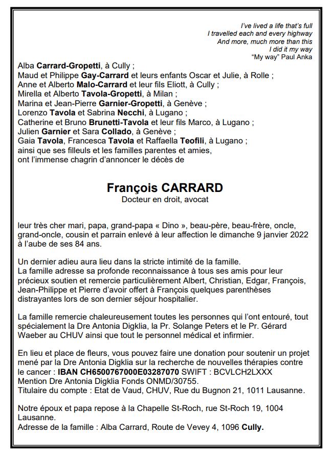 François CARRARD 19 jan. 1938 - 09 jan. 2022 Avis mortuaire PFG Télecharger PDF Partager sur: Galerie PreviousNext PreviousNext