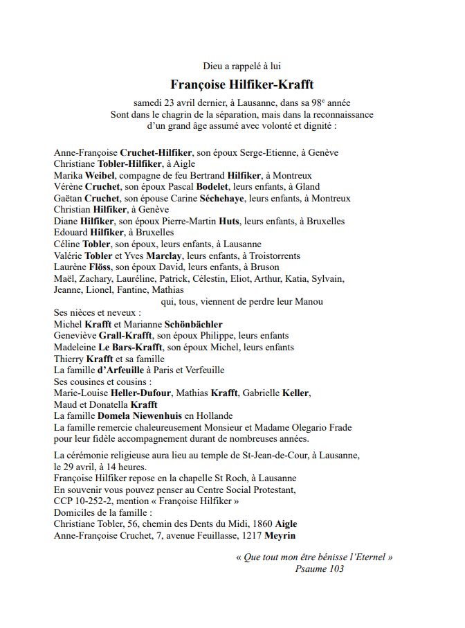 Françoise Hilfiker-Krafft 13 oct. 1924 - 23 avr. 2022 Avis mortuaire PFG Télecharger PDF Partager sur: Galerie PreviousNext PreviousNext