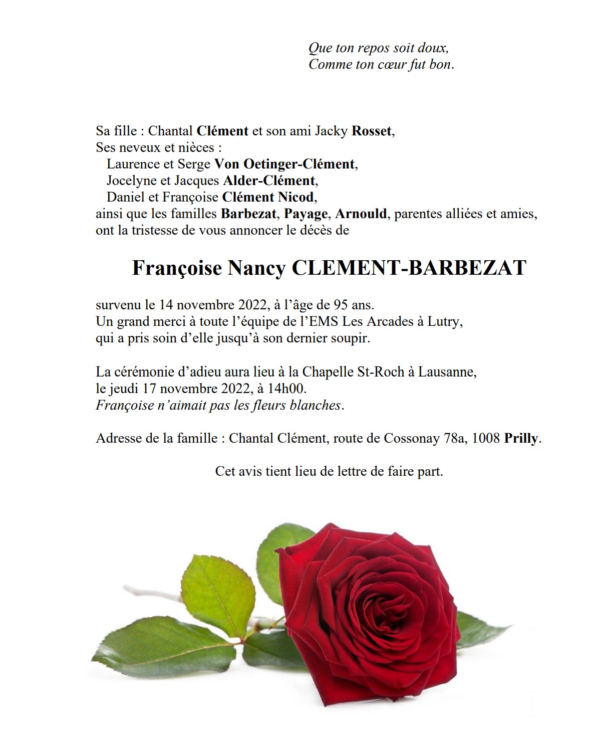 Françoise Nancy CLEMENT-BARBEZAT 18 mai. 1927 - 14 nov. 2022 Avis mortuaire PFG Télecharger PDF Partager sur: Galerie PreviousNext PreviousNext