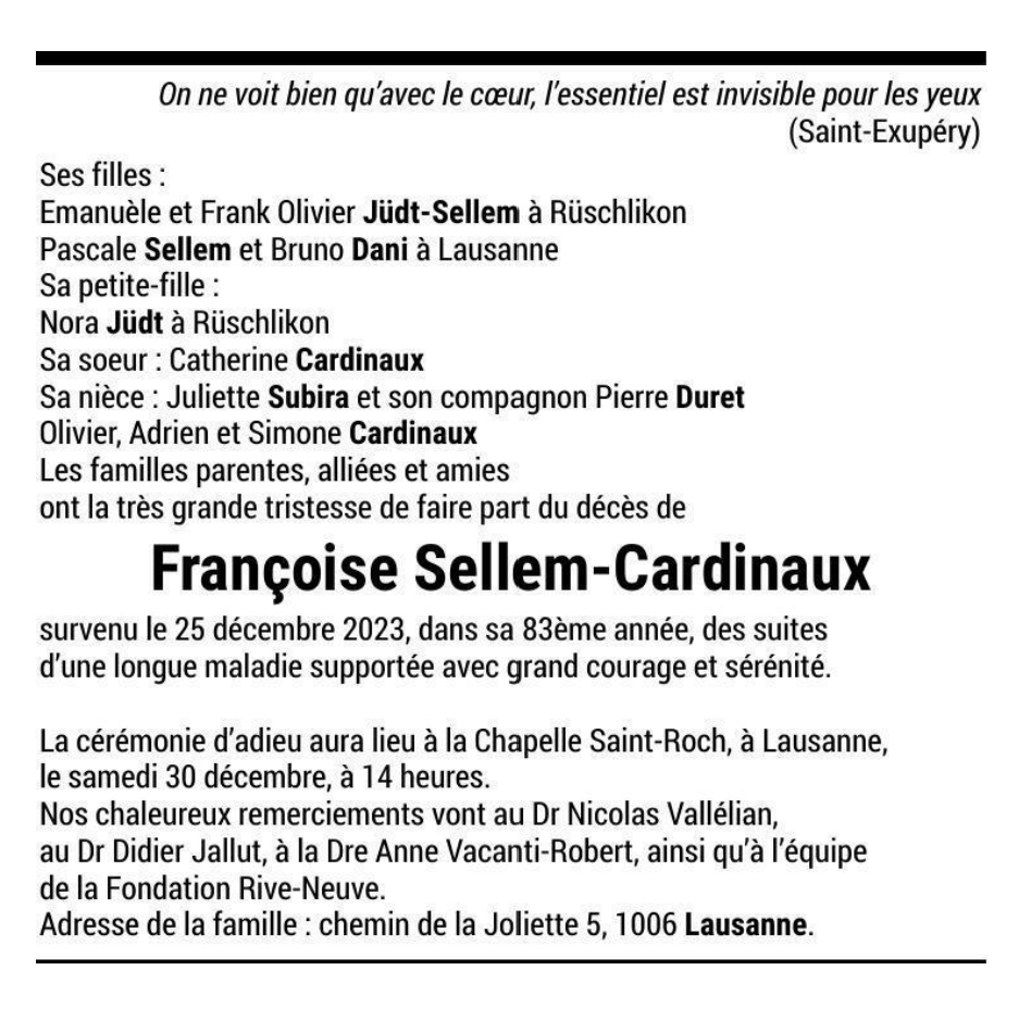 Françoise Sellem-Cardinaux 04 aoû. 1941 - 25 déc. 2023 Avis mortuaire PFG Télecharger PDF Partager sur: Galerie PreviousNext PreviousNext