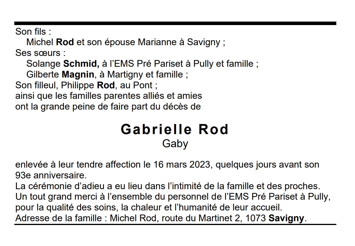 Gabrielle Rod 29 mar. 1930 - 16 mar. 2023 Avis mortuaire PFG Télecharger PDF Partager sur: Galerie PreviousNext PreviousNext