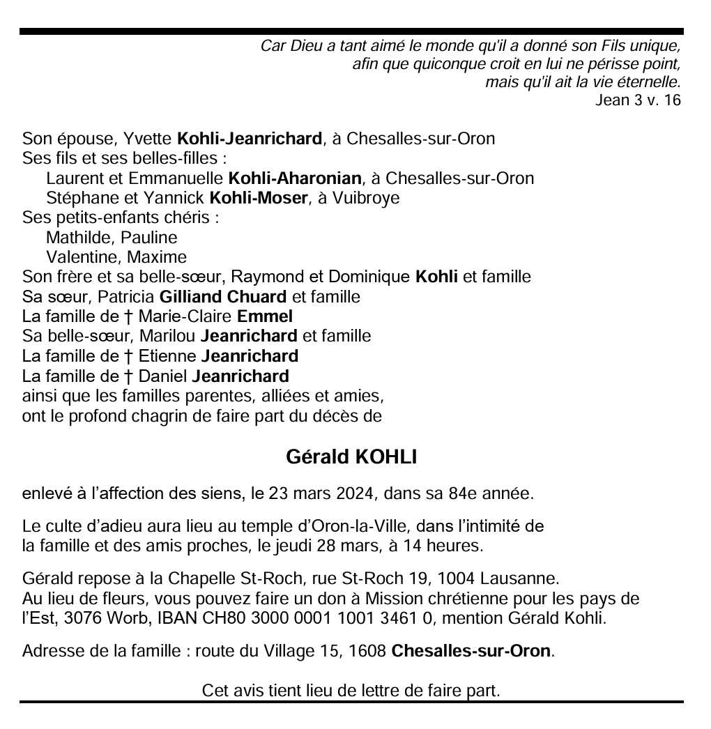 Gérald KOHLI 18 aoû. 1940 - 23 mar. 2024 Avis mortuaire PFG Télecharger PDF Partager sur: Galerie PreviousNext PreviousNext