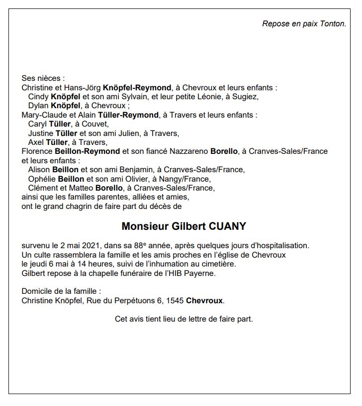 Gilbert CUANY 30 nov. 1933 - 02 mai. 2021 Avis mortuaire PFG Télecharger PDF Partager sur: Galerie PreviousNext PreviousNext