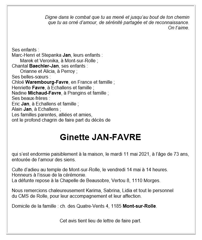 Ginette JAN-FAVRE 03 avr. 1948 - 11 mai. 2021 Avis mortuaire PFG Télecharger PDF Partager sur: Galerie PreviousNext PreviousNext