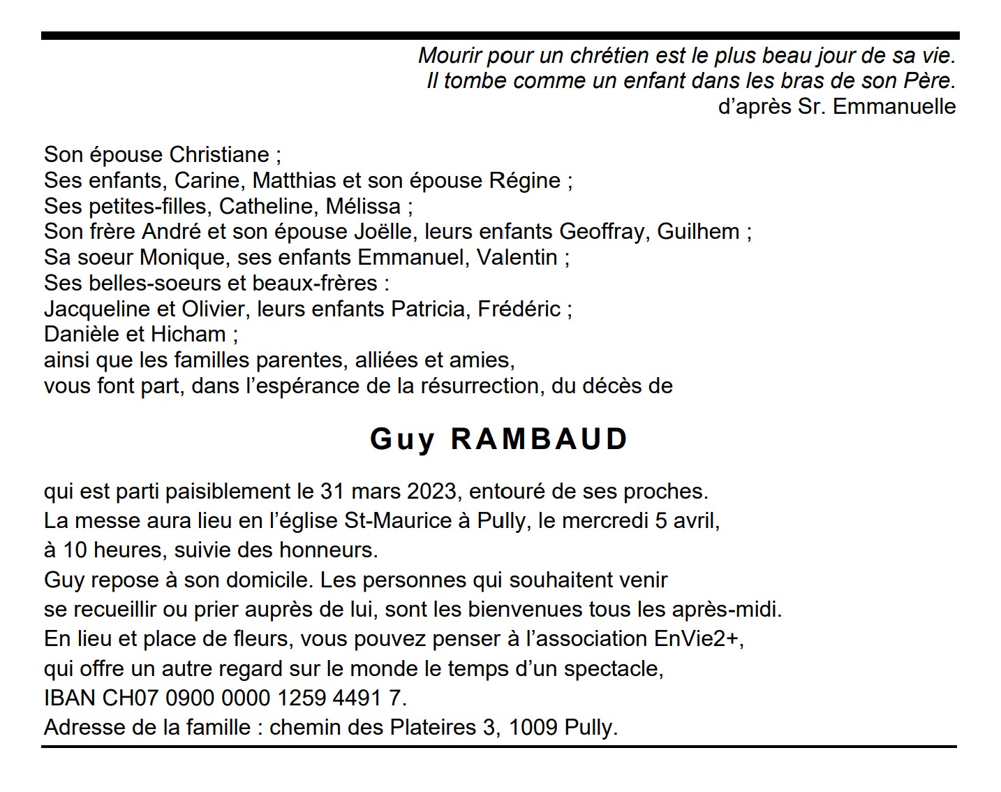 Guy RAMBAUD 22 aoû. 1946 - 31 mar. 2023 Avis mortuaire PFG Télecharger PDF Partager sur: Galerie PreviousNext PreviousNext