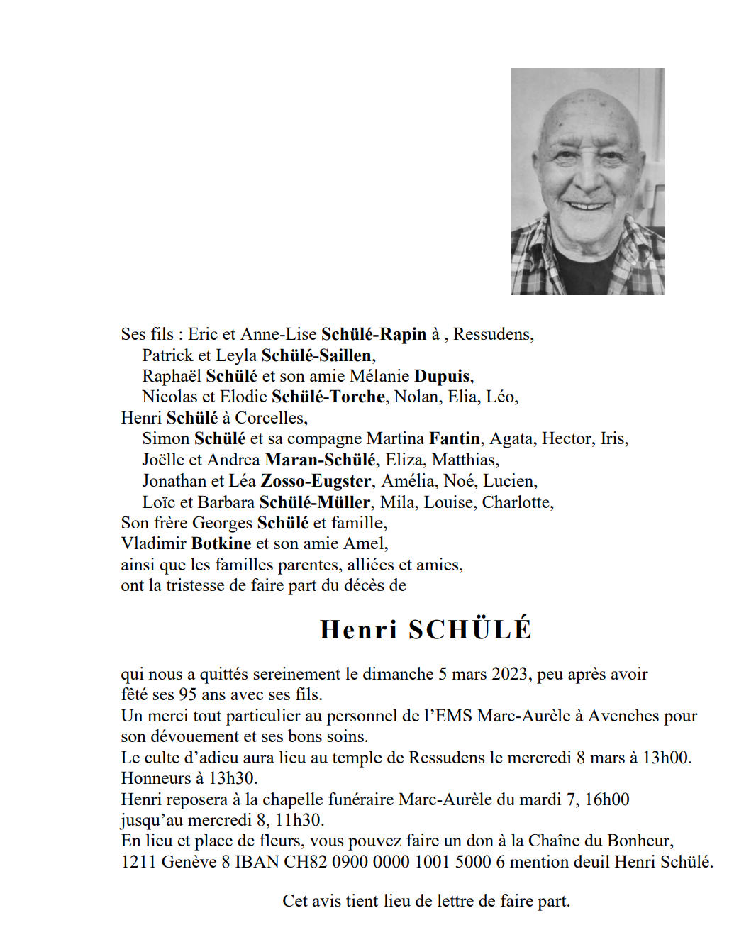 Henri SCHÜLÉ 26 fév. 1928 - 05 mar. 2023 Avis mortuaire PFG Télecharger PDF Partager sur: Galerie PreviousNext PreviousNext
