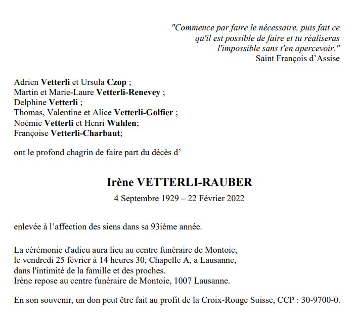 Irène VETTERLI-RAUBER 04 sep. 1929 - 22 fév. 2022 Avis mortuaire PFG Télecharger PDF Partager sur: Galerie PreviousNext PreviousNext
