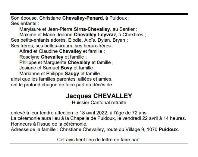 Jacques CHEVALLEY 11 jan. 1950 - 18 avr. 2022 Avis mortuaire PFG Télecharger PDF Partager sur: Galerie PreviousNext PreviousNext