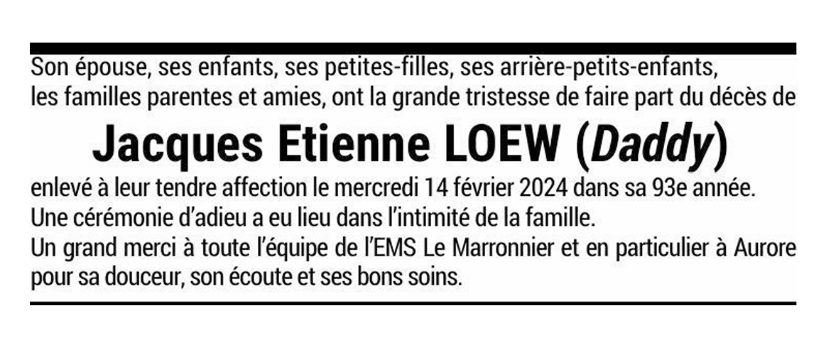 Jacques Etienne LOEW (Daddy) 06 oct. 1931 - 14 fév. 2024 Avis mortuaire PFG Télecharger PDF Partager sur: Galerie PreviousNext PreviousNext