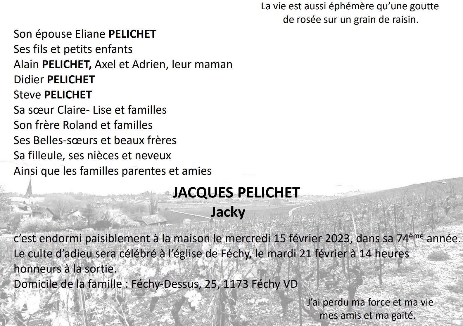 JACQUES PELICHET 14 déc. 1949 - 15 fév. 2023 Avis mortuaire PFG Télecharger PDF Partager sur: Galerie PreviousNext PreviousNext
