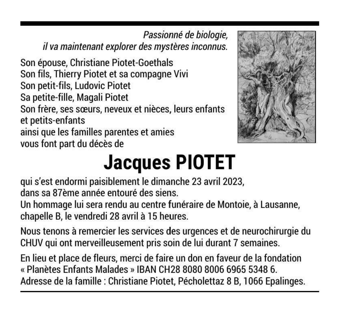 Jacques PIOTET 14 nov. 1936 - 23 avr. 2023 Avis mortuaire PFG Télecharger PDF Partager sur: Galerie PreviousNext PreviousNext