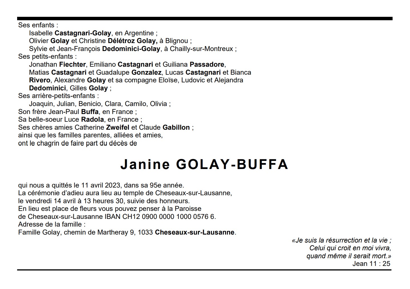 Janine GOLAY-BUFFA 19 oct. 1928 - 11 avr. 2023 Avis mortuaire PFG Télecharger PDF Partager sur: Galerie PreviousNext PreviousNext