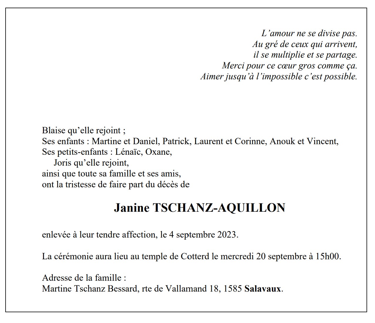 Janine TSCHANZ-AQUILLON 06 aoû. 1941 - 04 sep. 2023 Avis mortuaire PFG Télecharger PDF Partager sur: Galerie PreviousNext PreviousNext