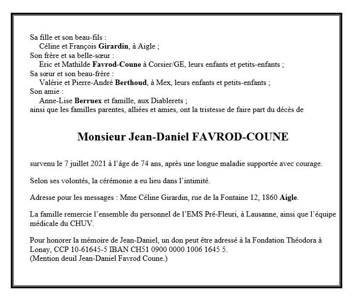 Jean-Daniel FAVROD-COUNE 13 jan. 1947 - 07 juil. 2021 Avis mortuaire PFG Télecharger PDF Partager sur: Galerie PreviousNext PreviousNext