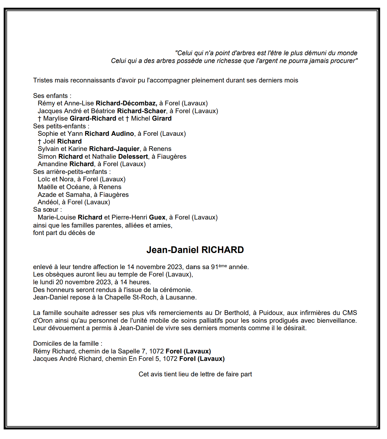 Jean-Daniel RICHARD 10 juin. 1933 - 14 nov. 2023 Avis mortuaire PFG Télecharger PDF Partager sur: Galerie PreviousNext PreviousNext