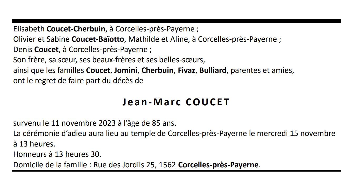 Jean-Marc COUCET 10 nov. 1938 - 11 nov. 2023 Avis mortuaire PFG Télecharger PDF Partager sur: Galerie PreviousNext PreviousNext