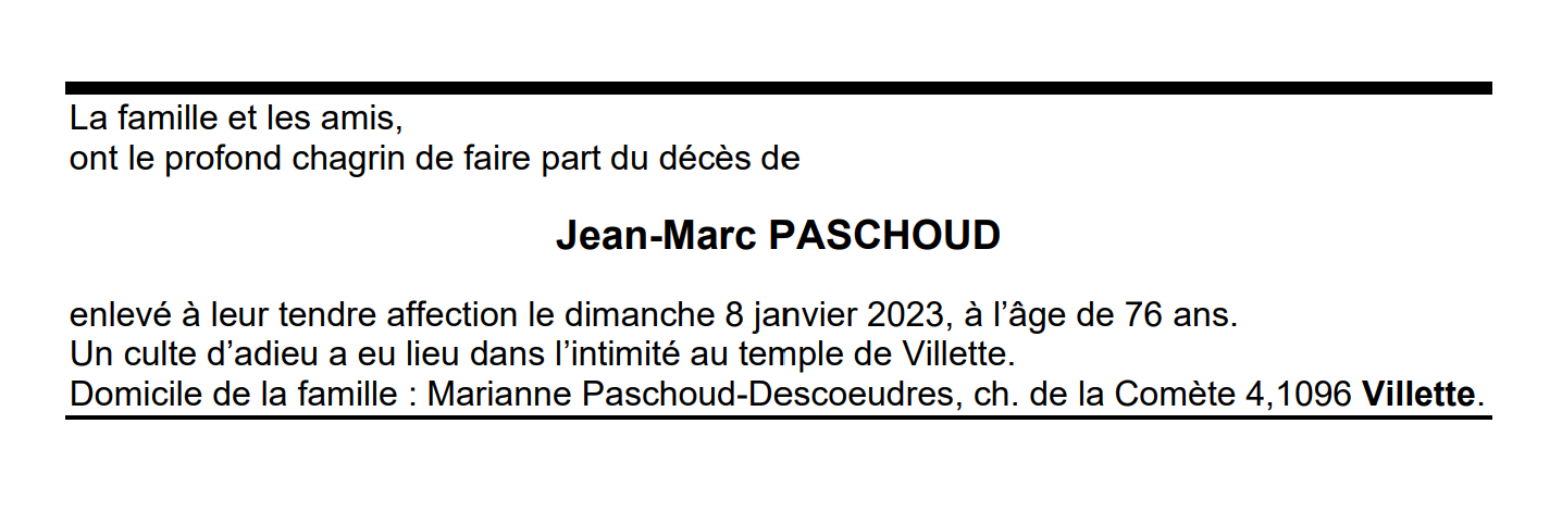 Jean-Marc PASCHOUD 03 déc. 1946 - 08 jan. 2023 Avis mortuaire PFG Télecharger PDF Partager sur: Galerie PreviousNext PreviousNext
