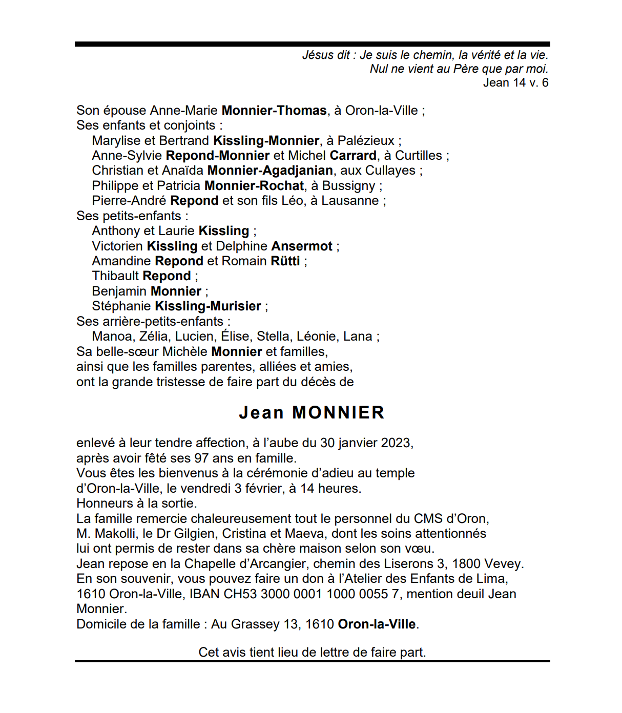 Jean MONNIER 29 jan. 1926 - 30 jan. 2023 Avis mortuaire PFG Télecharger PDF Partager sur: Galerie PreviousNext PreviousNext