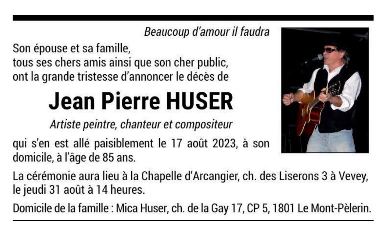 Jean-Pierre HUSER 03 fév. 1938 - 17 aoû. 2023 Avis mortuaire PFG Télecharger PDF Partager sur: Galerie PreviousNext PreviousNext
