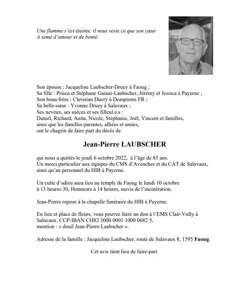 Jean-Pierre LAUBSCHER 10 aoû. 1937 - 06 oct. 2022 Avis mortuaire PFG Télecharger PDF Partager sur: Galerie