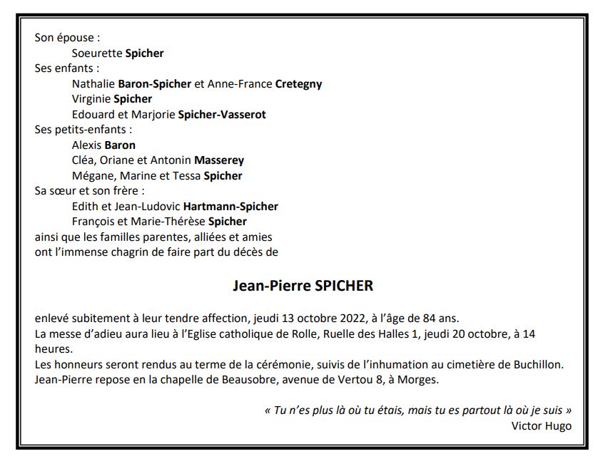 Jean-Pierre SPICHER 05 oct. 2022 - 13 oct. 2022 Avis mortuaire PFG Télecharger PDF Partager sur: Galerie PreviousNext PreviousNext
