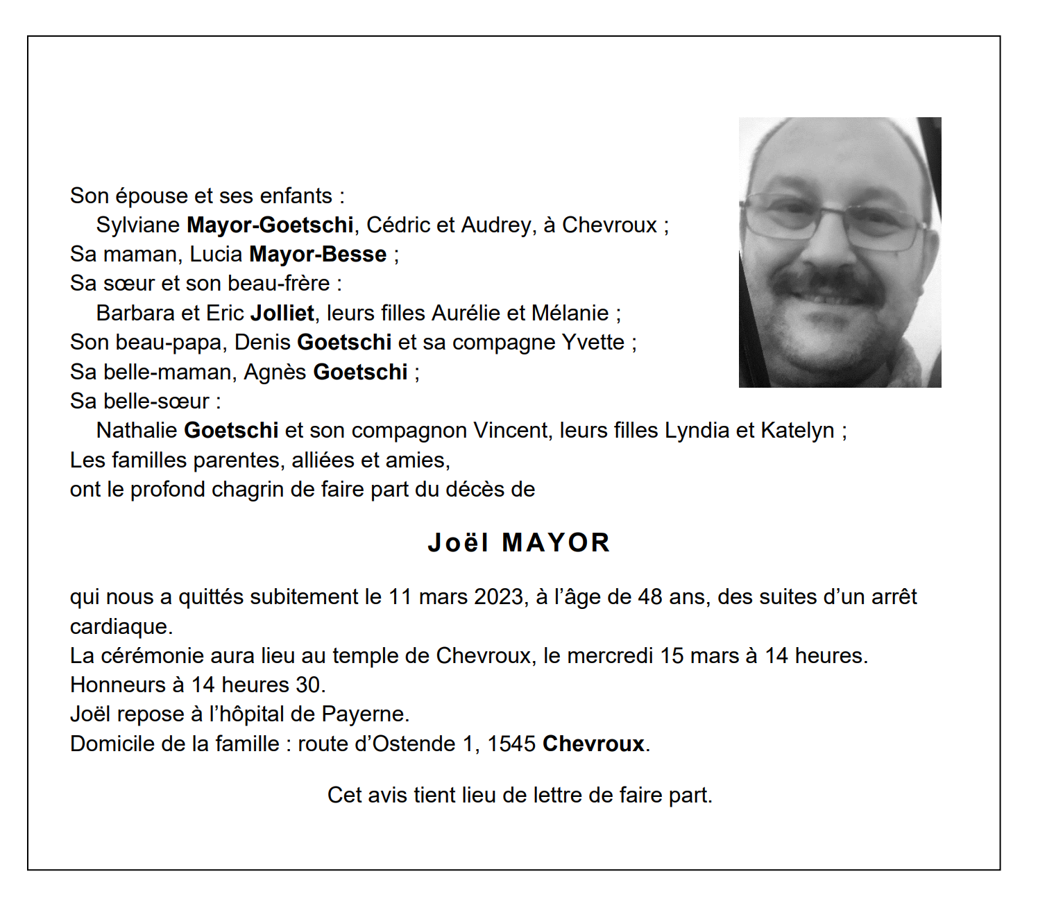 Joël MAYOR 22 fév. 1975 - 11 mar. 2023 Avis mortuaire PFG Télecharger PDF Partager sur: Galerie PreviousNext PreviousNext