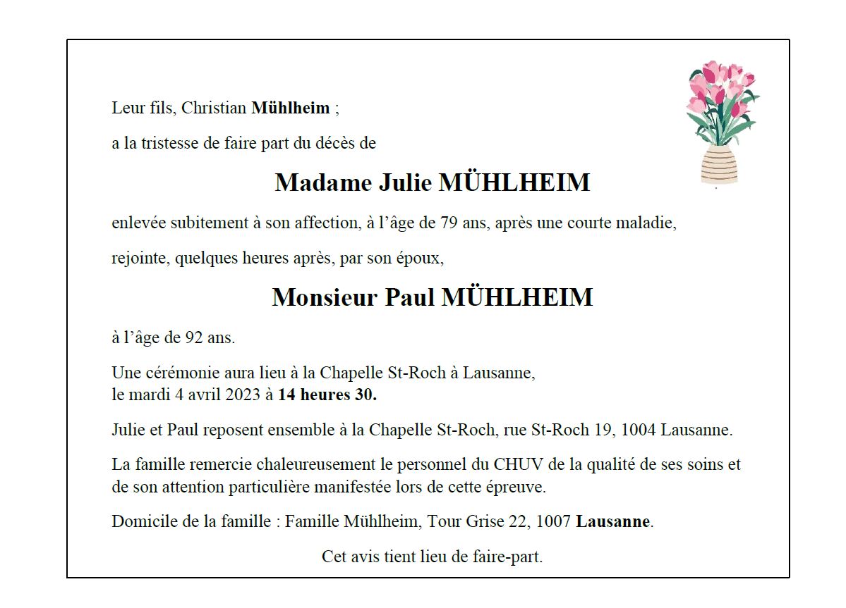 Julie et Paul MÜHLHEIM Avis mortuaire PFG Télecharger PDF Partager sur: Galerie PreviousNext PreviousNext